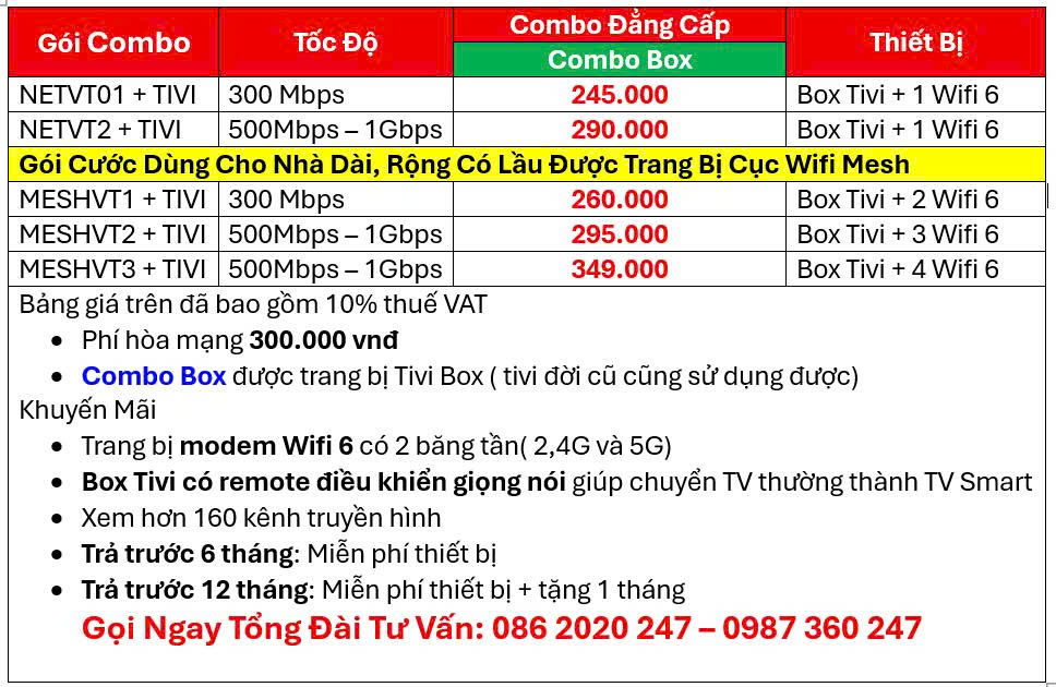 | MESHVT3 | 500 Mbps – 1Gbps | 299.000 | 4 thiết bị Wifi |